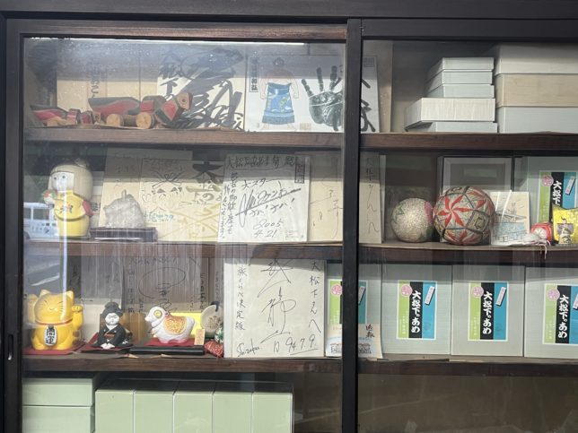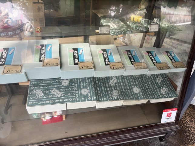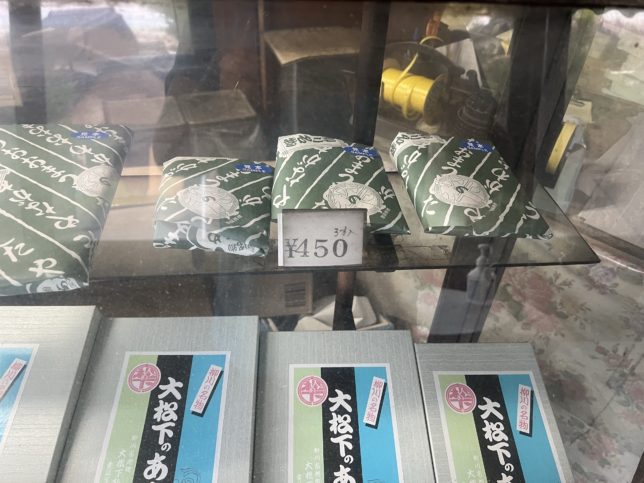 という大松下飴本舗さんの外観です。本吉屋さんから徒歩1分ほどの至近距離にあります。 店内に入りました。商品はもち飴のみですが、様々なサイズバリエーションがあります。1万円越えって何本入っているんだろう?