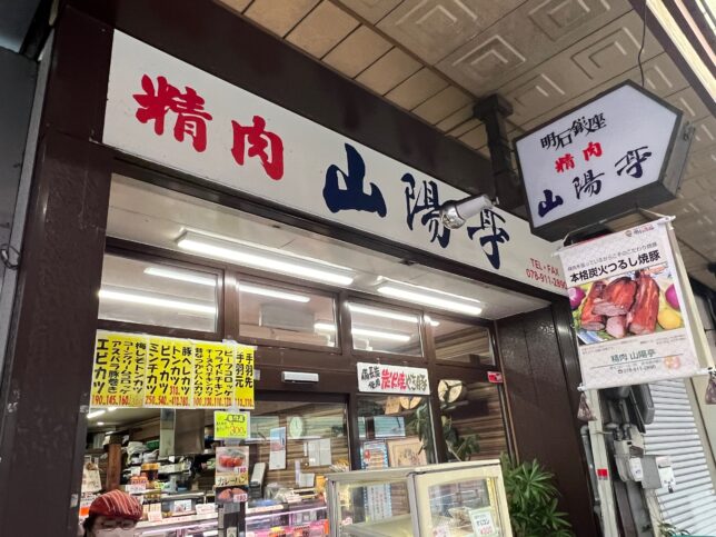 明石駅から徒歩7分ほどの場所、明石市鍛冶屋町・明石銀座に店舗を構える 精肉 山陽亭。1907年(明治40年)に創業した精肉店 兼 惣菜店です。揚げたてのコロッケや炭火焼きの焼き豚が名物で賑わっておりましたが、2025年8月に廃業されました。店主の高齢化と諸事情によるものとのこと。廃業前に訪問しておりましたので、写真をご紹介します(明石市本町の洋食 山陽亭さんは分家にあたり今も元気に営業中です)。