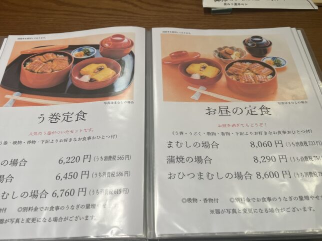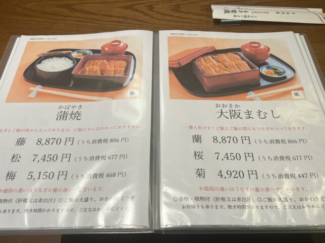 メニュー表です。左の蒲焼はご飯と蒲焼が別々のタイプ、右の大阪まむしはお重に入っているだけでなく、見えないご飯部分の間にもうなぎがいます。すごい豪華だな。