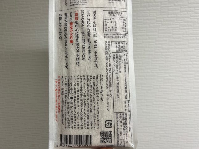 パッケージ下部は献上そばと呼ばれていた話と、食べ方が書かれています。茹でた後の洗い方が丁寧に書かれていて、冷たいそばの場合は1分30秒を目安に洗いくださいと書かれています。体感よりもずっと長めの時間ですね。