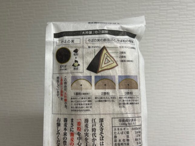 パッケージ裏側の上部です。蕎麦の大吟醸の説明が書かれています。そばの実の中心部の1番粉を利用しているという図ですね。