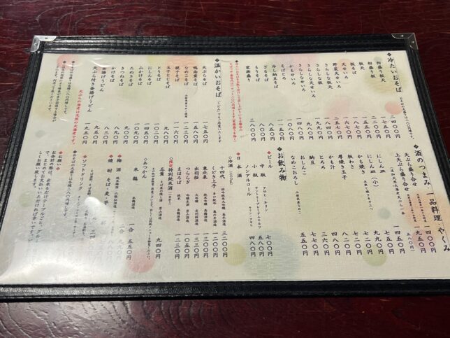 店内に入りました。こちらがメニュー表です。冷たいおそば・温かいおそば・酒のつまみ・飲み物に分かれています。名物は冷たいおそばの1番最初に乗っている相盛り板天です。