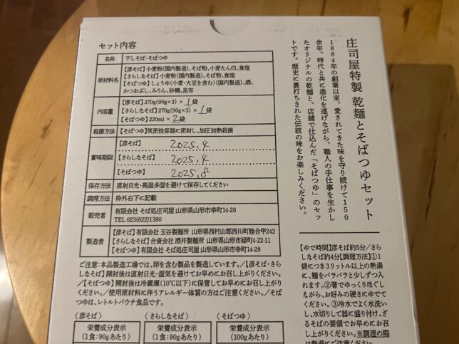 こんな感じで乾麺と蕎麦つゆがついていて、こちらももりそば的な彦そばとさらしなのセットになっています。