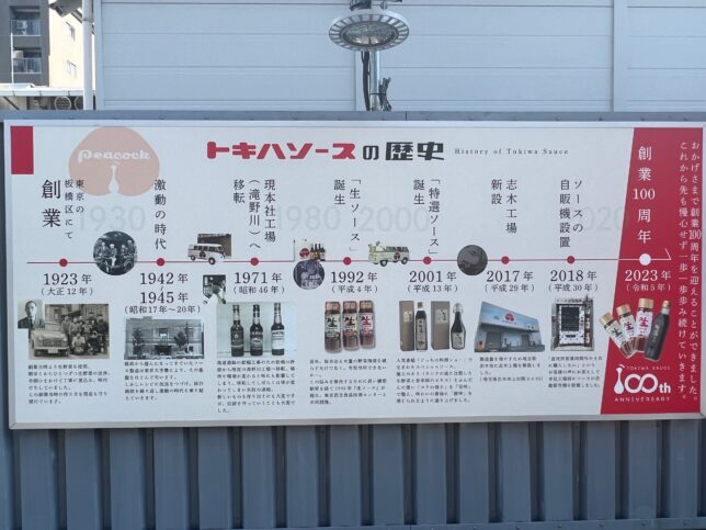 本社前には歴史紹介の看板が。こういうのがあると分かりやすくて良いですよね。