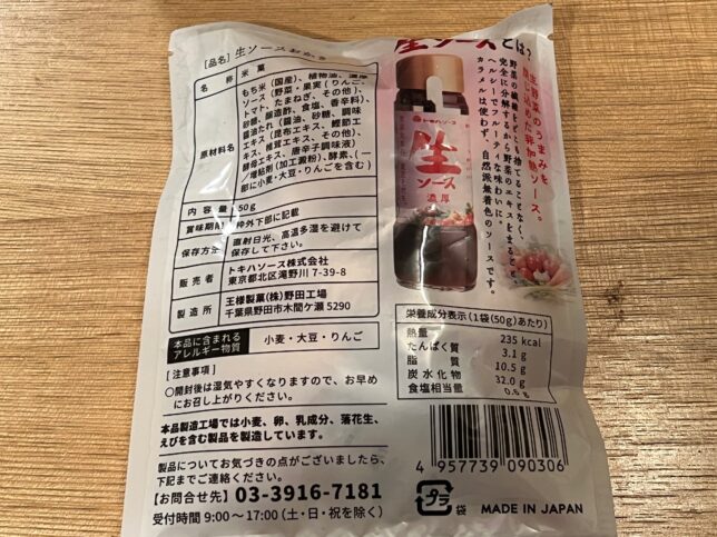 こちらが定番商品・生ソース濃厚です。生の文字が印象的なデザインです。”東京生まれ、東京そだち。”のコピーが良い。