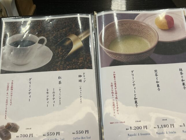 メニューは和菓子・お薄のセットや、コーヒーもありました。これぐらいの老舗店でコーヒーあるとインパクトありますね。