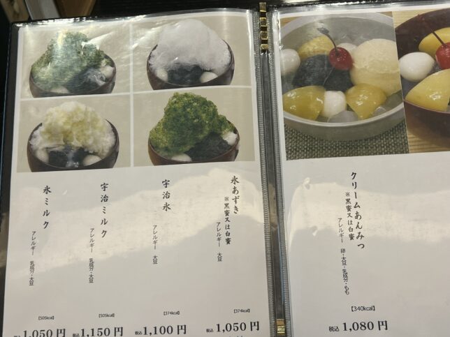 今回はあんみつを狙ってきたのですが、この日暑くってかき氷に惹かれ始め…、左のページが気になり始めます。だって宇治の抹茶使っているんだもの。