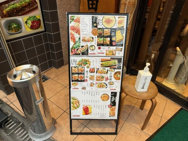 店頭の看板です。夜訪問だったので、居酒屋っぽいメニューも沢山紹介されていました。