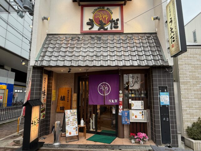 という、お食事処うえださんの外観です。右に駅が見えるぐらい至近距離です。