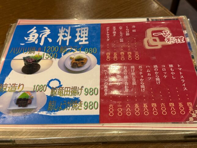 こちらが鯨料理と、一品料理のメニュー。実はこの時ガッチョから揚げがあるのを見逃しておりオーダーできず。ガッチョ = メゴチのことです。