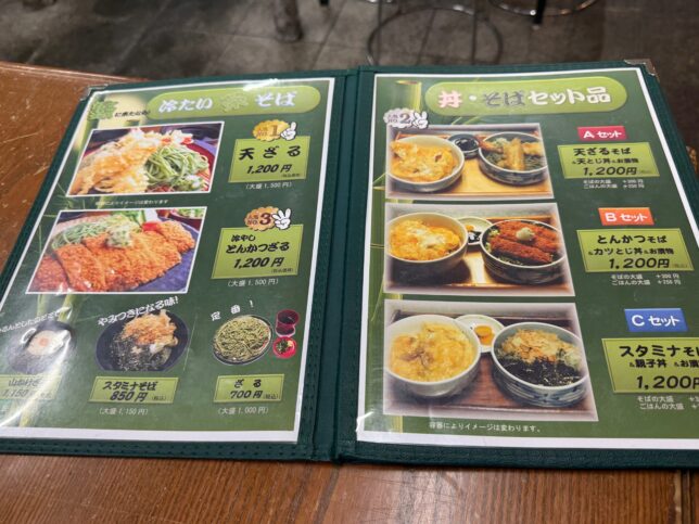 メニューです。人気No.1は天ざる、No2が天ざるそばのAセット・天とじ丼付きです。が、この日は天ぷらが終わってしまっておりました。