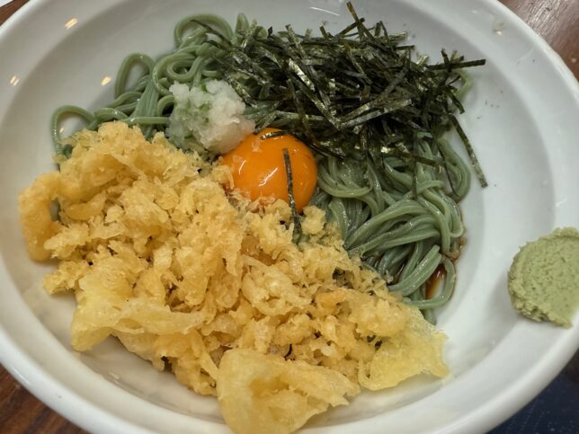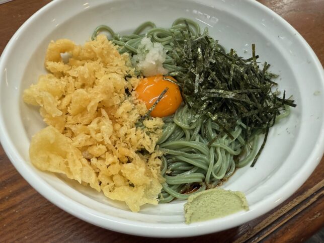 今回はスタミナそばをオーダーしました。茶そばに生卵・天かす・刻み海苔・大根おろしが乗っています。