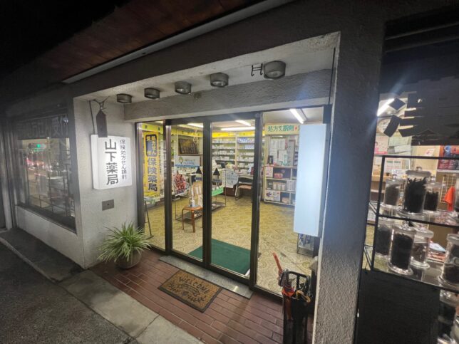 という山下薬局さんの外観です。保険処方箋を受け付けて、漢方薬の販売もある由緒正しい薬局なのです。ちなみに建物も築200年とかなりの歴史があります。