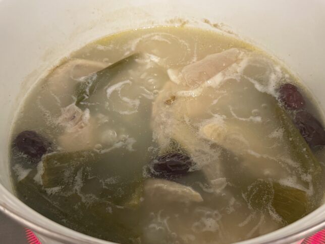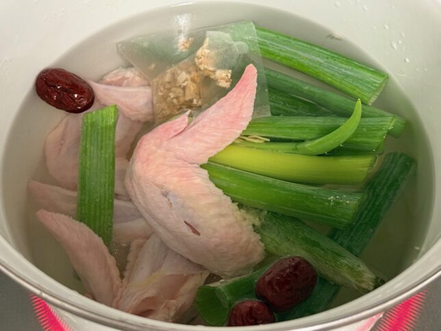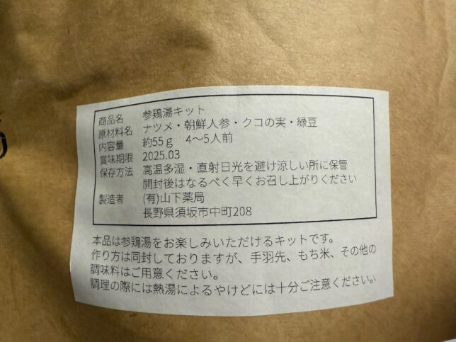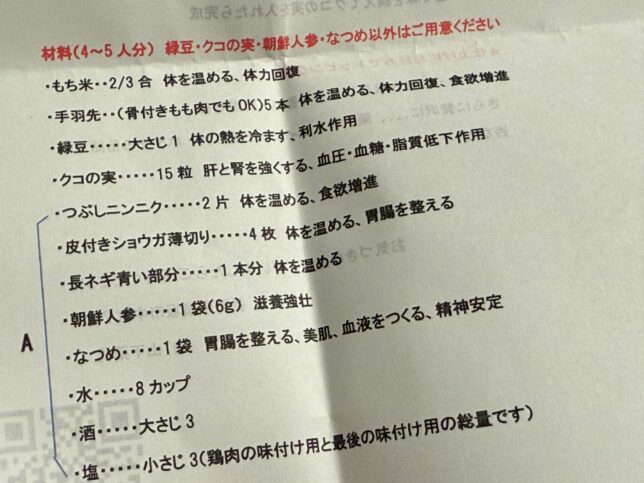 パッケージ裏側です。ナツメ・朝鮮人参・クコの実・緑豆等が入っているそう。で、手羽先・餅米等は自分で買う必要があります。