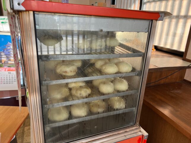 こちらが午前中に売り切れることもあるという、おやき。ホットケースで温められているのが良いですね。