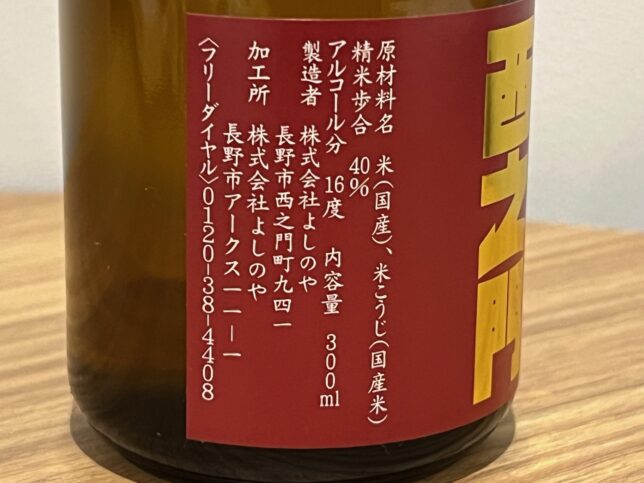 ラベル横側です。原材料は国産の米・米麹のみ。精米歩合は40%です。